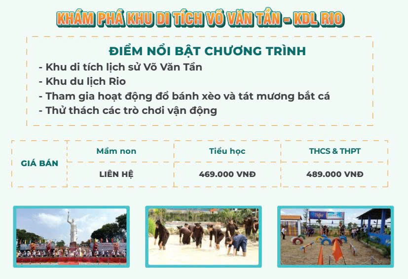 SÁNG: Xe và HDV của VNGROUP TOURIST đón Quý Thầy cô và các em học sinh tại trường, khởi hành đi khu di tích lịch sử Võ Văn Tần. Quý khách dùng bữa sáng nhẹ trên xe. Trên đường đi, HDV giao lưu, sinh hoạt trên xe với nhiều trò chơi để nhận phần quà hấp dẫn. ● Khu di tích lịch sử Võ Văn Tần – một địa điểm quan trọng ghi dấu cuộc biểu tình chống Pháp của người dân Đức Hòa. Nơi đây, đồng chí Võ Văn Tần, Bí thư Xứ ủy Nam Kỳ, đã cùng đồng chí Châu Văn Liêm lãnh đạo cuộc biểu tình. Khu di tích này không chỉ là nơi tham quan, tưởng niệm mà còn là địa điểm giáo dục truyền thống cho học sinh, sinh viên và du khách. ● Khu du lịch Rio – một điểm đến nghỉ dưỡng và vui chơi giải trí hấp dẫn dành cho gia đình, bạn bè và du khách. Nơi đây nổi bật với không gian xanh mát, hồ bơi rộng lớn cùng nhiều tiểu cảnh đẹp mắt, thích hợp cho hoạt động thư giãn, chụp ảnh và tổ chức sự kiện. Khu du lịch không chỉ mang đến trải nghiệm vui chơi giải trí mà còn là điểm hẹn lý tưởng để du khách tận hưởng những giây phút thoải mái, gần gũi với thiên nhiên. TRƯA: Đoàn dùng cơm trưa tại nhà hàng trong khu du lịch với thực đơn đặc sản địa phương. Sau đó đoàn sẽ cùng nhau tham gia vào nhiều hoạt động thú vị với các trò chơi hấp dẫn và sôi nổi: Cầu lắc, đu dây văng, kéo co, bịt mắt bắt vịt, đua xe đạp chậm qua cầu khỉ, nhảy bao bố… Sau khi trải nghiệm những hoạt động sôi nổi, đoàn sẽ di chuyển đến khu vực “tát mương bắt cá” để trải nghiệm làm một người nông dân trong trang phục áo bà ba, bắt cá bằng những dụng cụ có sẵn. Đặc biệt, Quý khách được trải nghiệm “hoạt động đổ bánh xèo” với các nguyên liệu dân dã được KDL chuẩn bị sẵn và cùng nhau thưởng thức đặc sản do chính mình chế biến. TỐI: Kết thúc các hoạt động vui chơi, quý khách tắm nước sạch, thay đồ và khởi hành về điểm đón ban đầu. Về đến điểm đón ban đầu. Kết thúc chương trình, VNGROUP TOURIST xin hẹn gặp lại Quý khách ở những hành trình khác. **Lưu ý: Thứ tự chương trình có thể hoán đổi tùy theo thực tế nhưng vẫn đảm bảo đủ điểm trong chương trình. CHÚC QUÝ KHÁCH CÓ CHUYẾN ĐI VUI VẺ & BỔ ÍCH!
