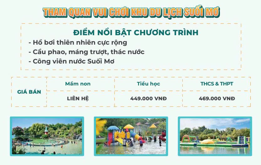 SÁNG: Xe và hướng dẫn viên đón Quý thầy cô và các em học sinh tại trường. Khởi hành đi KDL Suối Mơ - Đồng Nai. Quý khách dùng bữa sáng trên xe (bánh mì/bánh bao/ nước). Tiếp tục cuộc hành trình. Trên Xe HDV sẽ tổ chức một số trò chơi, giao lưu ca hát….để nhận được những món quà lưu niệm. TRƯA: Quý khách đến Tân Phú – Đồng Nai. Đoàn di chuyển đến tham quan và vui chơi tại Công Viên Nước Suối Mơ. Quý khách sẽ được hòa mình với “Hồ Bơi Tự Nhiên” rộng hơn 1000m2, check in với “ Ốc Đảo Kem “ và “Vườn Hoa Hướng Dương” Quý khách còn có thể tham gia các hoạt dưới nước rất hấp dẫn như: Moto nước, nhà phao liên hoàn, massage cá,… (chi phí tự túc) Quý khách ăn trưa tại nhà hàng trong Khu du lịch Suối Mơ kết hợp team lunch. Tổng kết chương trình, phát quà – chụp ảnh lưu niệm. TỐI: Sau đó, Đoàn di chuyển ra xe, đoàn rời khỏi KDL Suối Mơ khởi hành về lại TP.HCM. Quý khách nghỉ ngơi trên xe. Đoàn dừng chân nghỉ ngơi tại trạm dừng chân, tiếp tục lộ trình. Đoàn về điểm đón ban đầu, kết thúc chuyến tham quan, hướng dẫn chia tay đoàn, hẹn gặp quý khách trên những hành trình kết nối tiếp theo. **Lưu ý: Thứ tự chương trình có thể hoán đổi tùy theo thực tế nhưng vẫn đảm bảo đủ điểm trong chương trình. CHÚC QUÝ KHÁCH CÓ CHUYẾN ĐI VUI VẺ & BỔ ÍCH!